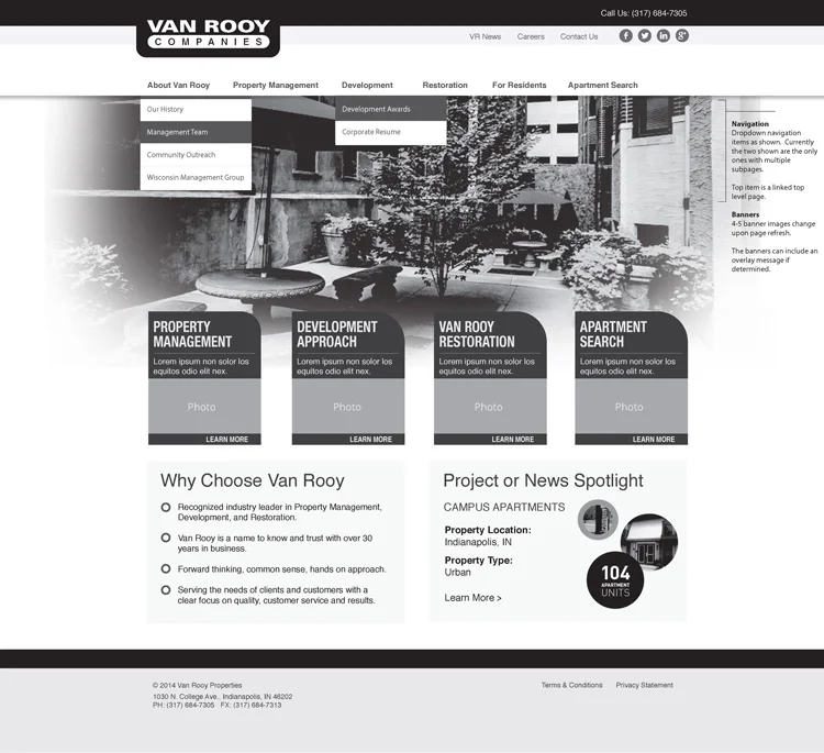 Van Rooy Companies, a recognized leader in Property Management, Development, and Restoration, needed to update its website. Working with the Van Rooy team and site users through working sessions, concepts, iterations and user testing, an updated web / mobile UI was implemented that supports the Van Rooy brand and site users in its approach and design.